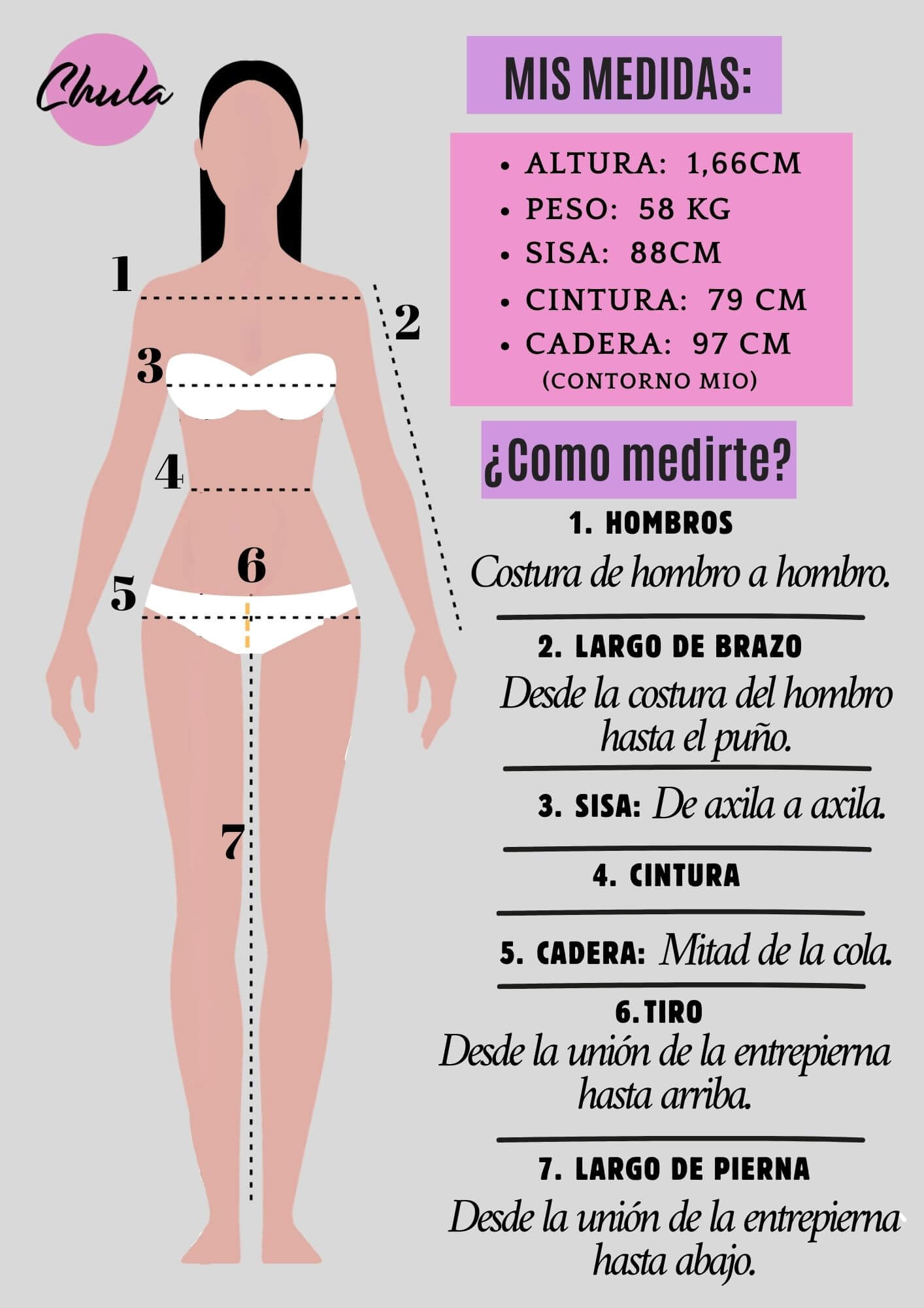 Para tomar las medidas, usa una prenda tuya. Apoyala sobre una superficie plana y sin estirarla, toma las medidas como se muestra en la TABLA.