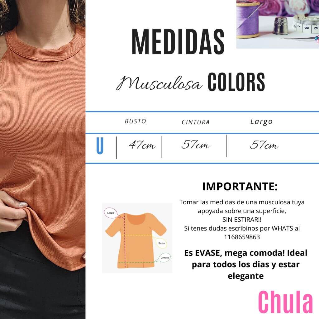 Para tomar las medidas, usa una musculosa que te quede perfecta, apoyala sobre una superficie plana y sin estirarla, toma las medidas como se muestra en la TABLA.