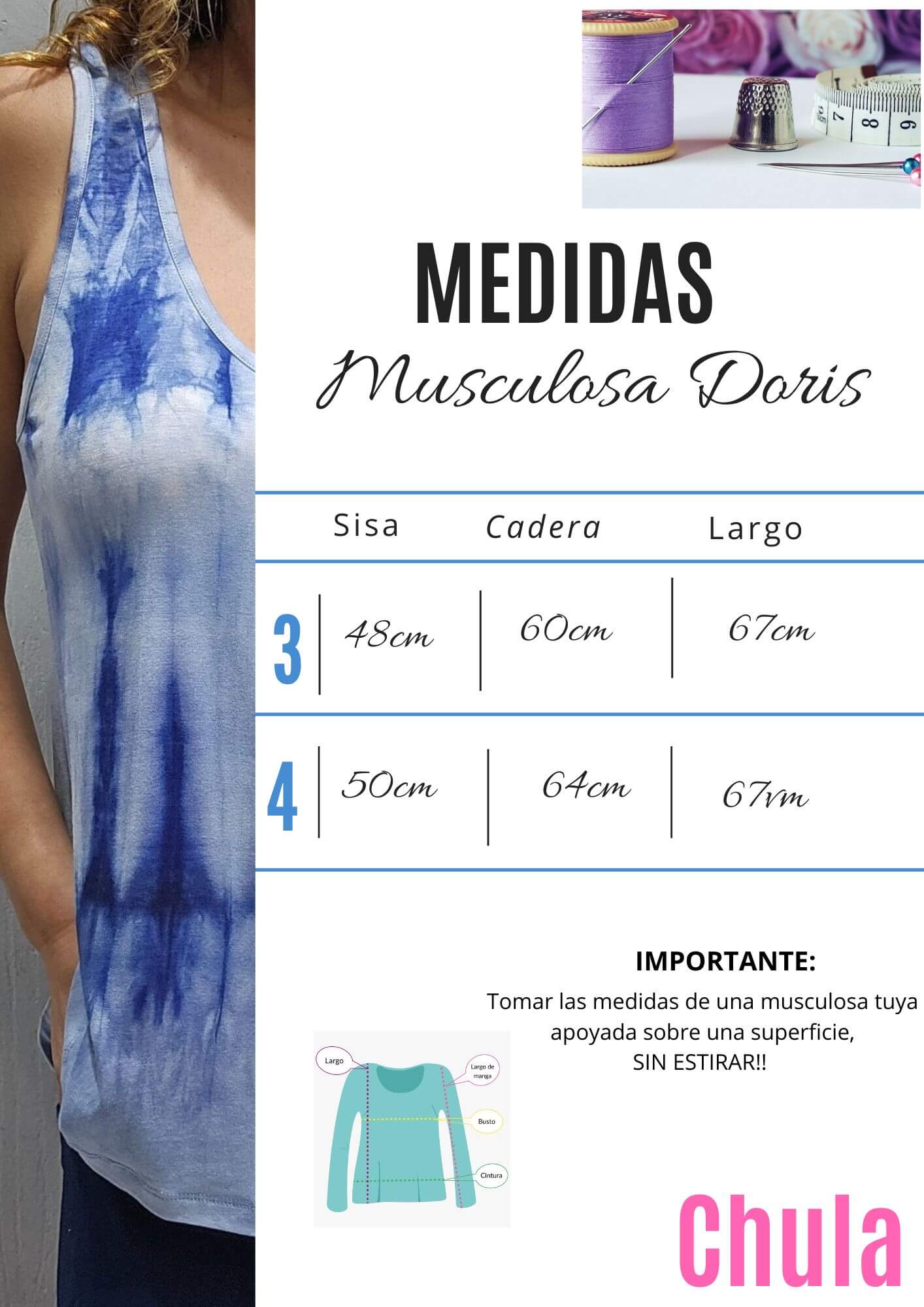 Para tomar las medidas, usa una prenda tuya que te quede perfecta, apoyala sobre una superficie plana y sin estirarla, medila como se muestra en la TABLA.