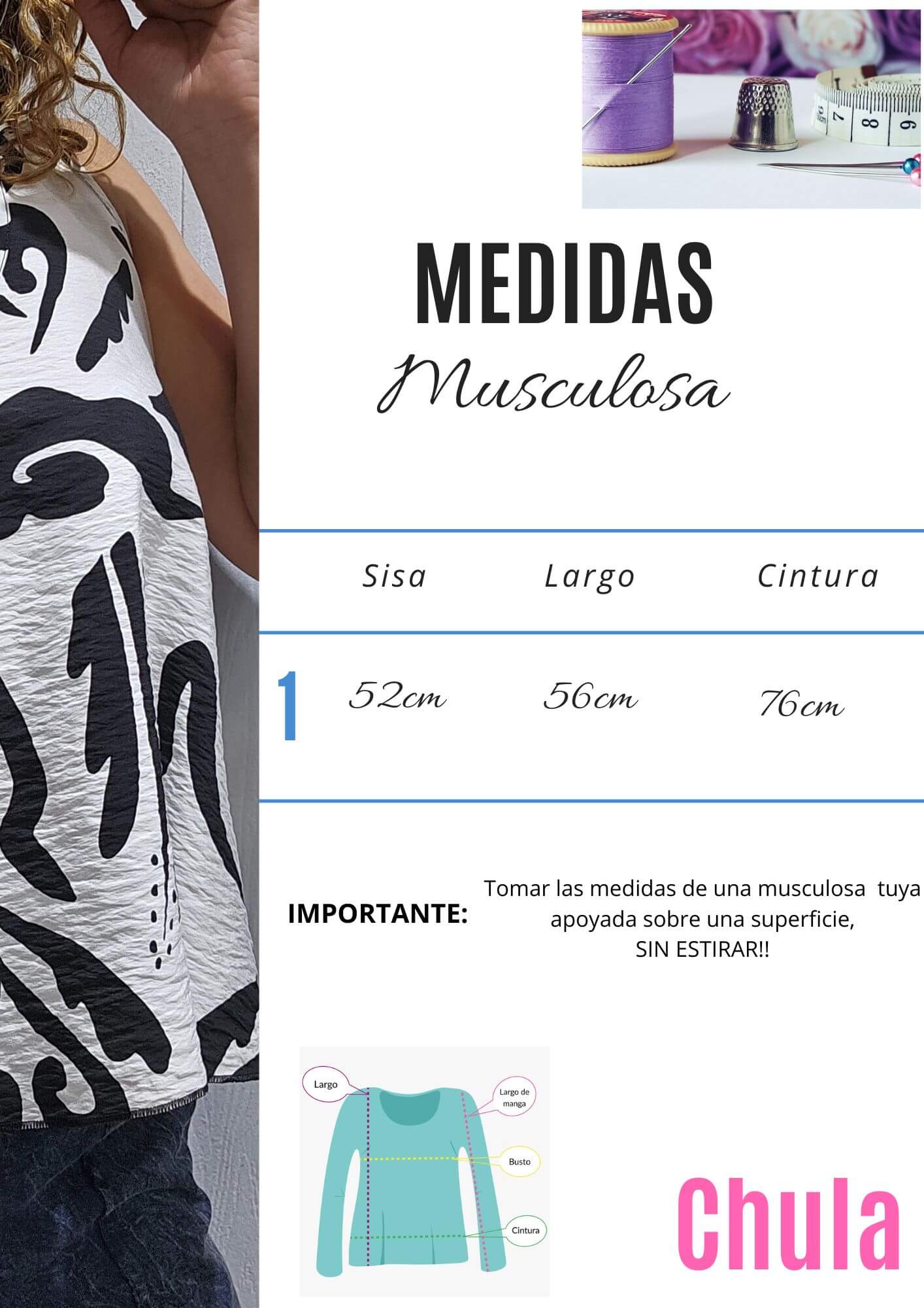 Para tomar las medidas, usa una musculosa que te quede perfecta, apoyala sobre una superficie plana y sin estirarla, toma las medidas como se muestra en la TABLA.